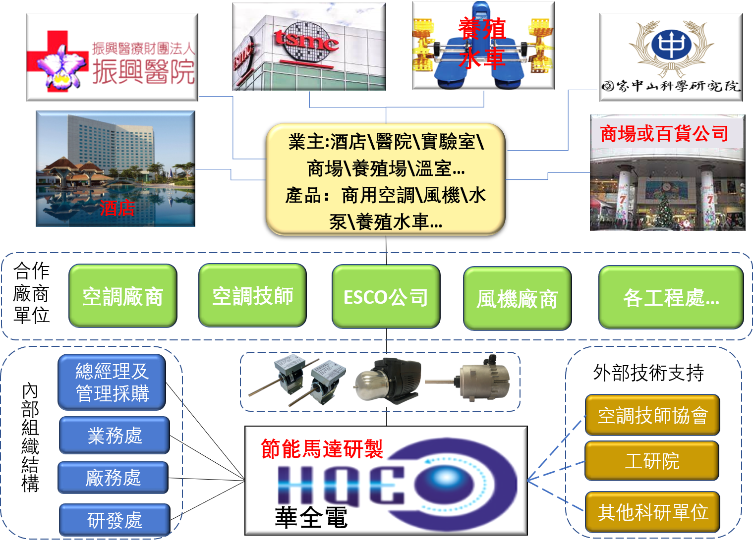 华全电专注马达的研制,整合空调厂商,空调技师,ESCO公司(Energy Service Company)、风机厂商及各工程处等资源,为业主提供高效节能电机,真正实现经济节能、低维护成本、AI智能联合管理电机系统。业主包括酒店、医院、实验室、商场、养殖场、温室等拥有长时间运转电机设备的场所。内部组织包括业务、厂务、研发等部门,外部技术支持包括空调技师协会、工研院等科研单位,以保证公司具备最先进的科技和核心竞争力,长期处于行业领先地位。